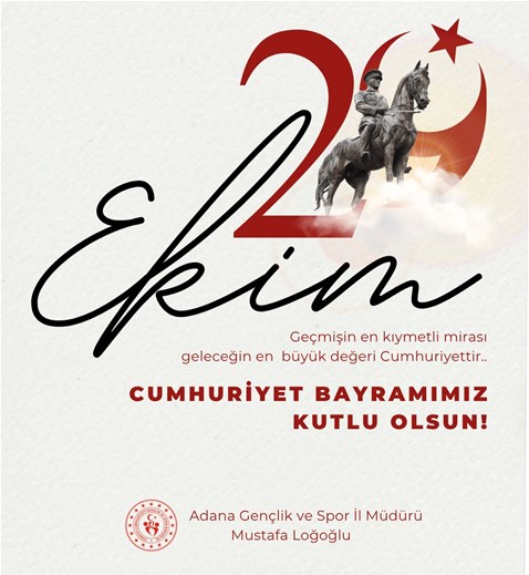Gazi Mustafa Kemal Atatürk’ün bizlere emanet ettiği Cumhuriyet, özgürlüğümüzün ve çağdaş geleceğimizin simgesidir. Adana Gençlik ve Spor ailesi olarak; gençlerimizi Cumhuriyetimizin değerleriyle yetiştirmek, bu emaneti ilelebet yaşatmak için durmaksızın çalışıyoruz. Başta Gazi Mustafa Kemal Atatürk olmak üzere, tüm şehit ve gazilerimizi rahmet, minnet ve şükranla anıyor; aziz milletimizin 29 Ekim Cumhuriyet Bayramı’nı yürekten kutluyorum.”